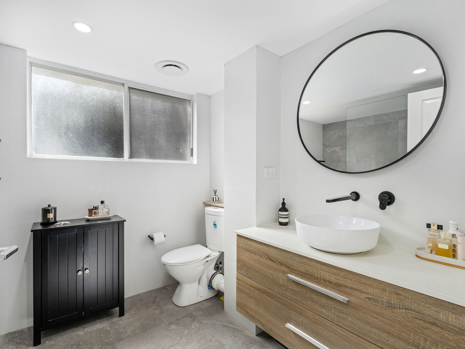 - Modern bathroom with oversized shower, luxury fixtures & floor to ceiling tiling.
