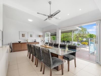 Seamless indoor-outdoor living includes a sparkling in-ground pool, a covered alfresco area, and an expansive indoor dining space-currently set with a ten-seater table-that opens through bi-fold doors to capture the perfect view, ideal for year-round gatherings.